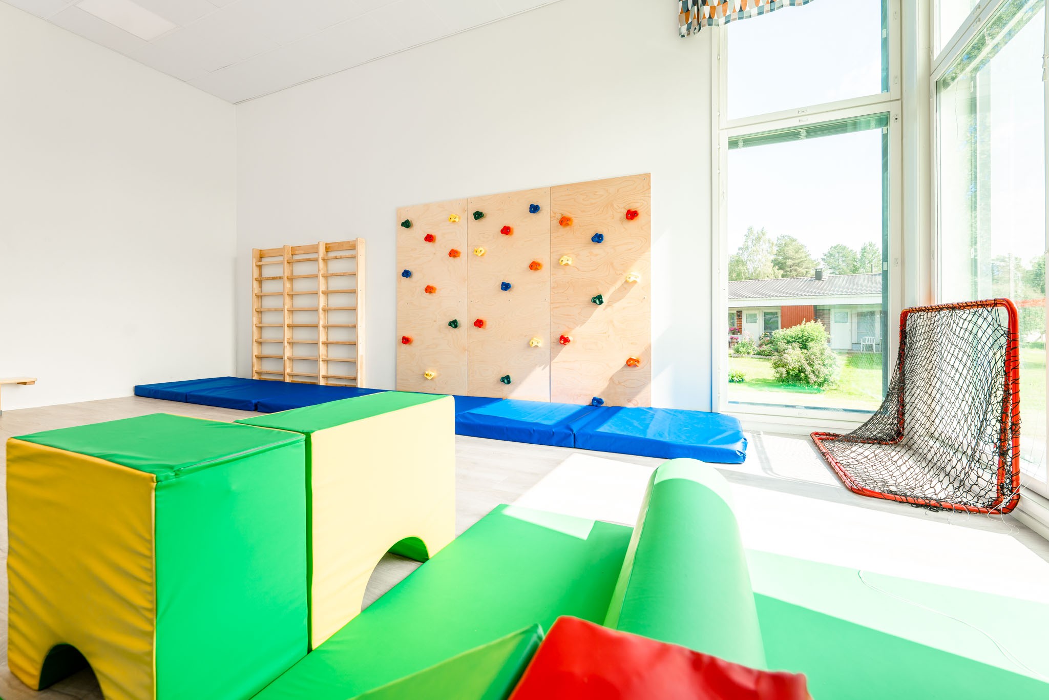 Olemme suunnitelleet HYVÄN OLON -päiväkotiin liikuntatilan, joka toimii joustavasti myös yhteiskäyttötilana. Liikuntatila tarjoaa lapsille paikan motoristen taitojen harjoitteluun ja antaa mahdollisuuden päivittäiseen liikuntahetkeen lattialla, puolapuissa, renkaissa tai kiipeilyseinällä. Henkilökunta voi halutessaan järjestää myös taukojumppia liikuntatilassa.